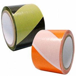 Fita para sinalização e segurança produzida a partir de um filme de polietileno de baixa densidade sem adesivo, com espessura de 0,03mm, impresso em três cores (preto/amarelo, laranja/branco e vermelho/branco) e colocada num tubete de papelão com diâmetro de 70mm.